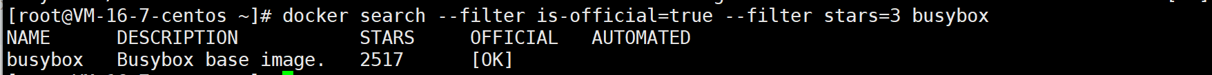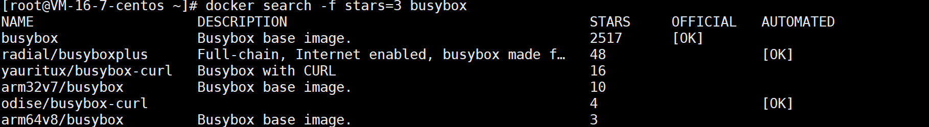 搜索 star 数量 >=3 且是官方版本的 busybox 镜像