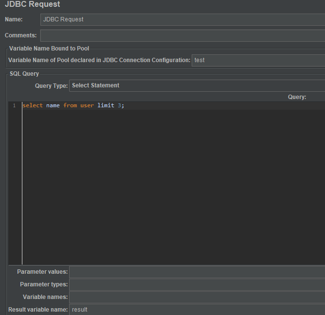 Variable Name of Pool declared in JDBC Connection Configuration:数据库连接池配置的名称,与 JDBC Connection Configuration 中一致
